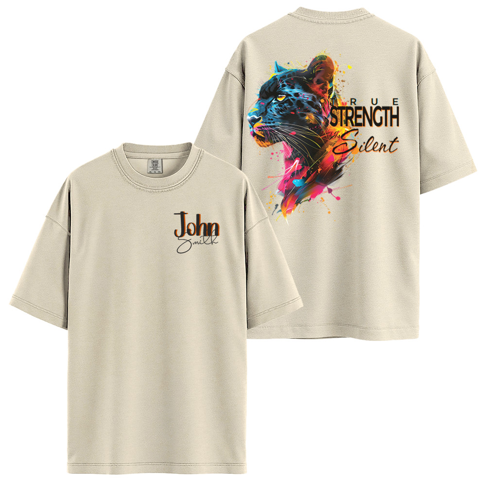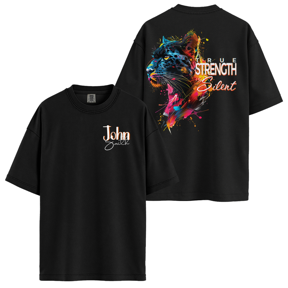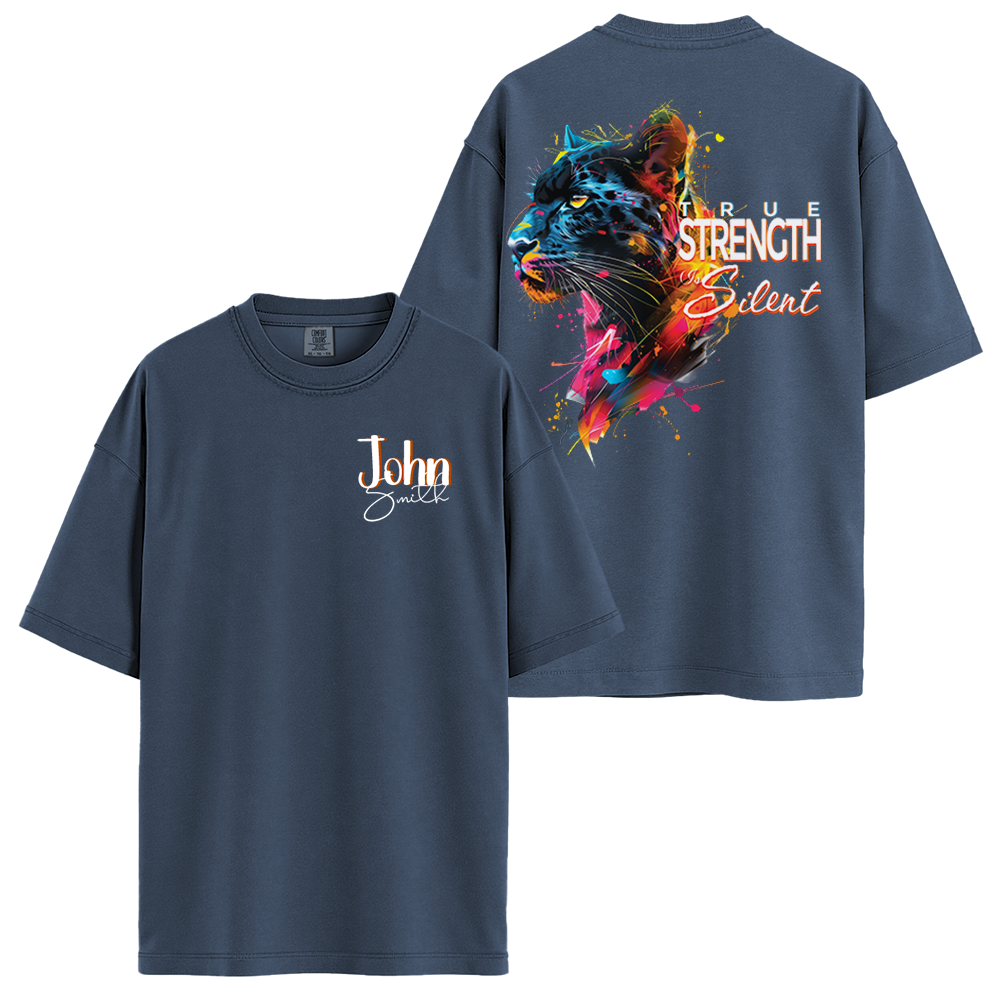 Embrace the quiet power within using our Personalize Silent Strength Black Panther motivation clothing. This vibrant, splash-art panther design carries the profound quote "True Strength Is Silent." Custom-made with your name on the chest, this motivation clothing is perfect for those who lead with action and stoic confidence. High-quality t shirts with quotes designed for a bold yet personalized look.
