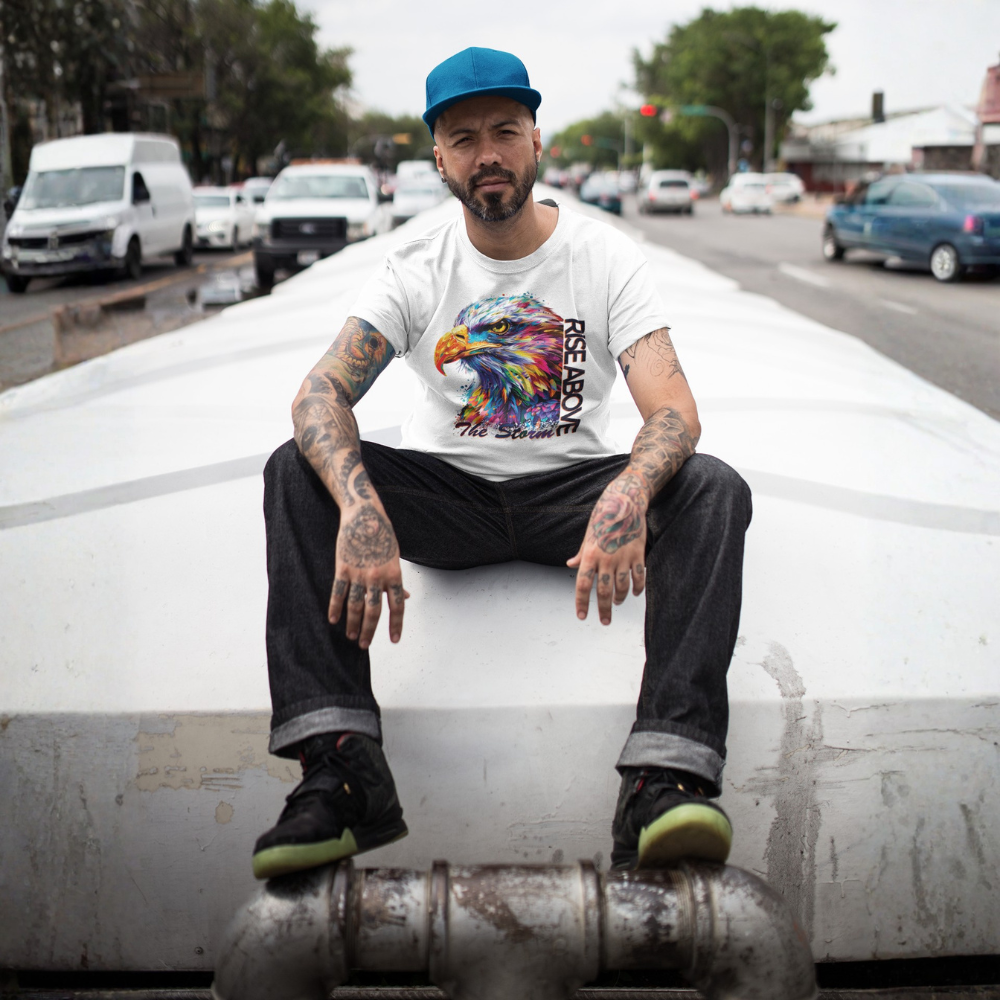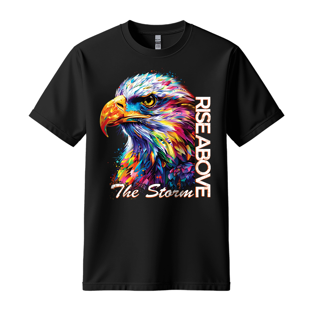 Conquer your challenges with this empowering Unisex T-Shirt. Featuring a magnificent eagle rendered in vibrant neon colors against a clean white background, this design brings the powerful mantra "Rise Above The Storm" to life.